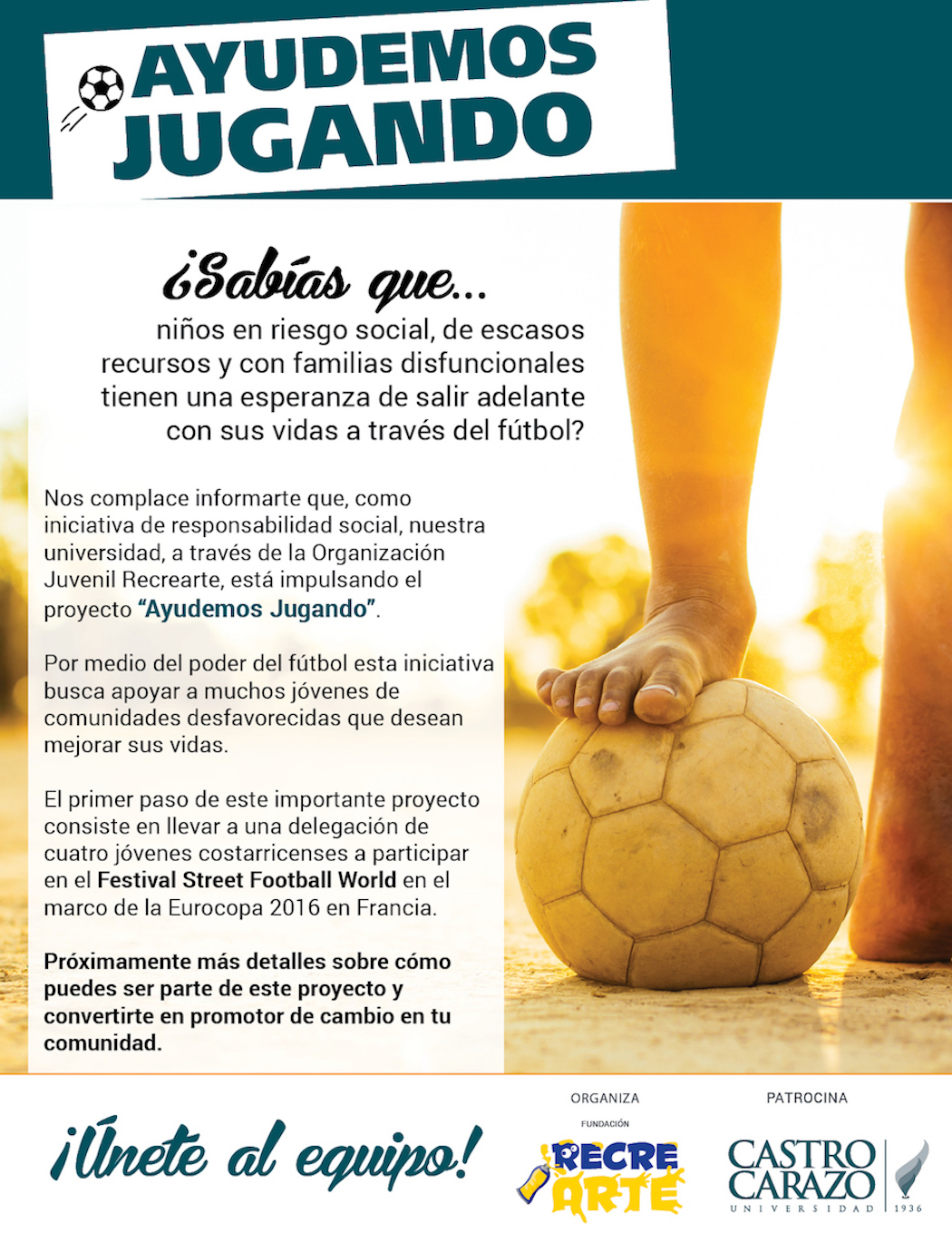 Además, con el fin de ampliar la recaudación de fondos, un importante grupo de empresas estaremos participando en un torneo de fútbol en las instalaciones de Proyecto Gol en San Rafael de Alajuela el sábado 4 de junio a partir de las 8:00 a.m. Nuestra selección de fútbol estudiantil nos estará representando en ésta competencia. Si usted desea asistir y motivar a nuestros jugadores, por favor háganoslo saber, pues el cupo es limitado y requeriríamos confirmación de su parte. El ingreso al proyecto Gol es totalmente gratis, pero se necesita contar con un brazalete especial para poder ingresar.