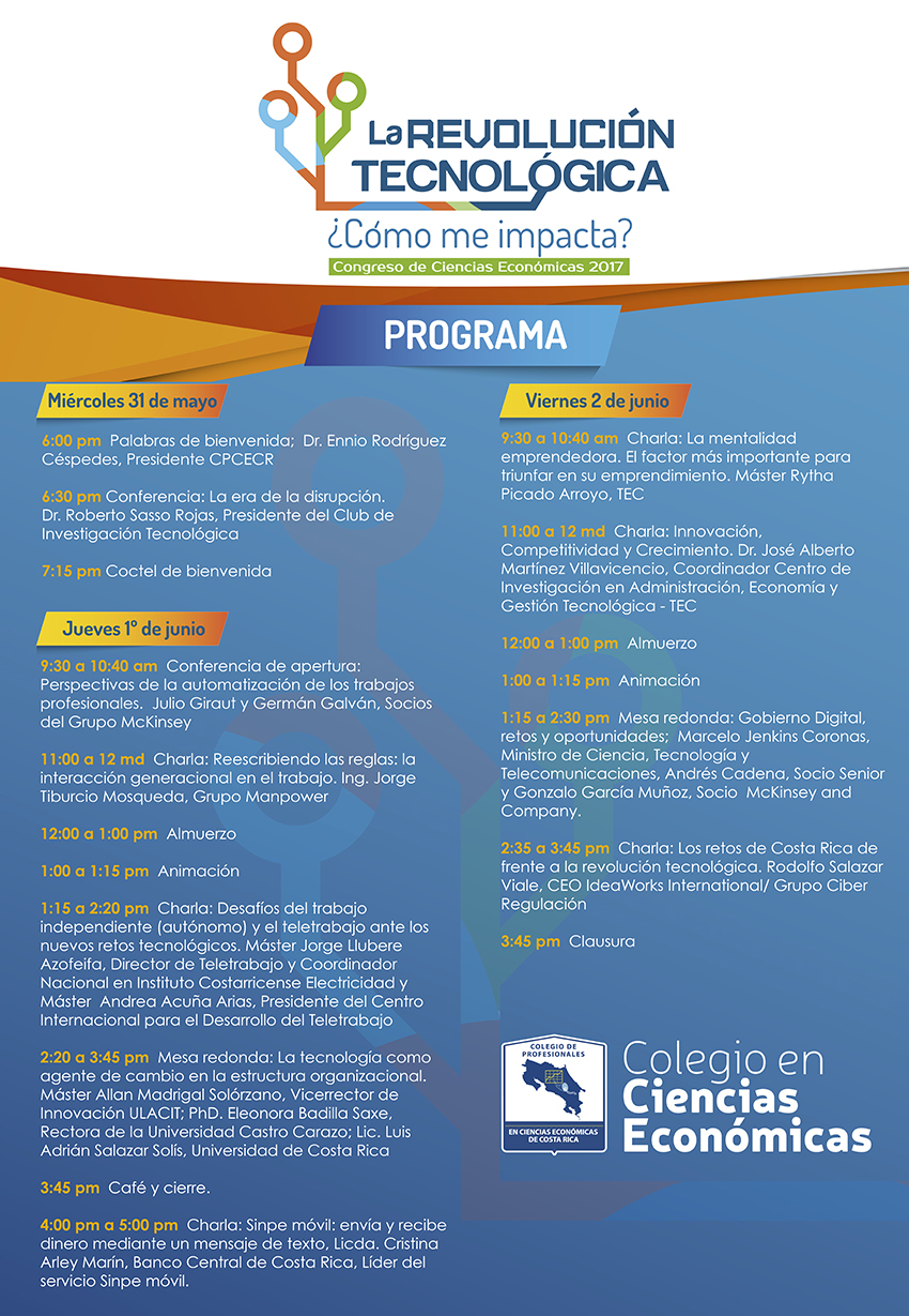 En el evento se analizarán tres importantes ejes: Las empresas: cómo la revolución tecnológica ha impacto y va a impactar en el futuro, a nivel de puestos de trabajo, nuevas habilidades y nuevas relaciones entre generaciones; el empleo: nuevas formas de generarlo a partir de la innovación y el emprendimiento y; la capacidad de Costa Rica para enfrentar la revolución tecnológica: los retos y oportunidades como país.