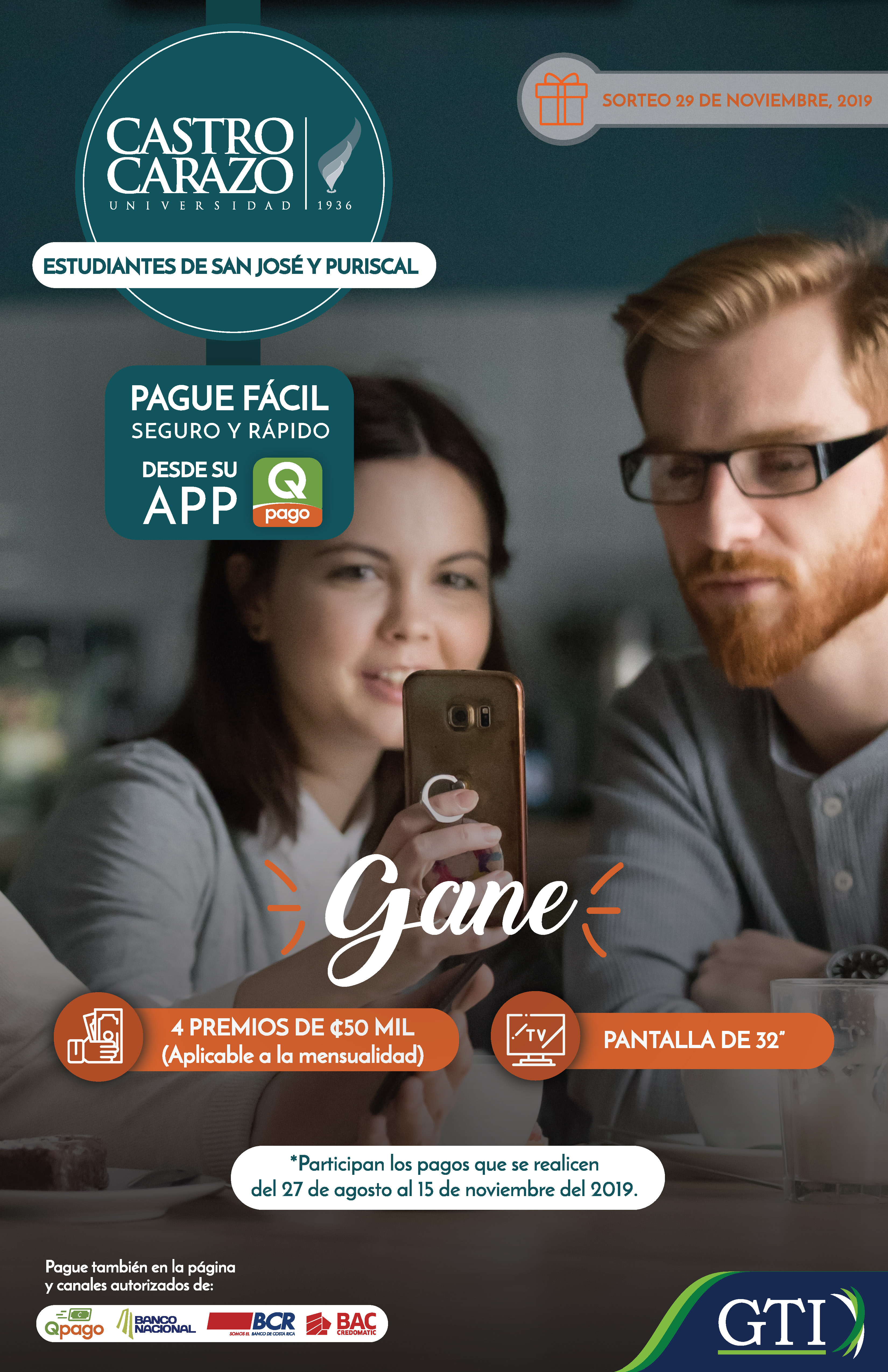 Realizá tus pagos a través del APP "QPago" o en las plataformas de los bancos: BAC SAN JOSÉ, BANCO DE COSTA RICA, BANCO NACIONAL DE COSTA RICA y quedá participando por:
