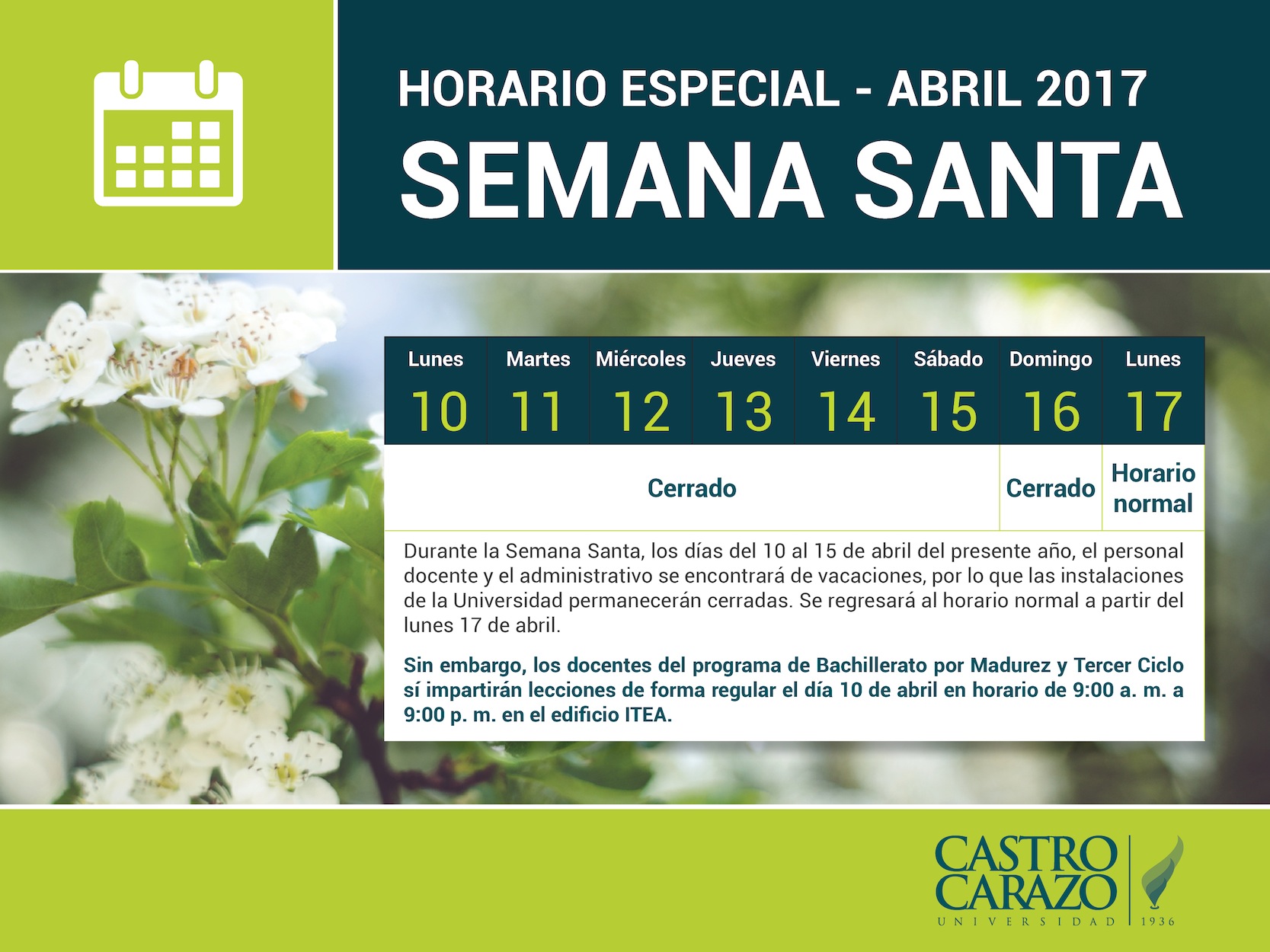 Durante la Semana Santa, los días del 10 al 15 de abril del presente año, el personal docente y el administrativo se encontrará de vacaciones, por lo que las instalaciones de la Universidad permanecerán cerradas. Se regresará al horario normal a partir del lunes 17 de abril.