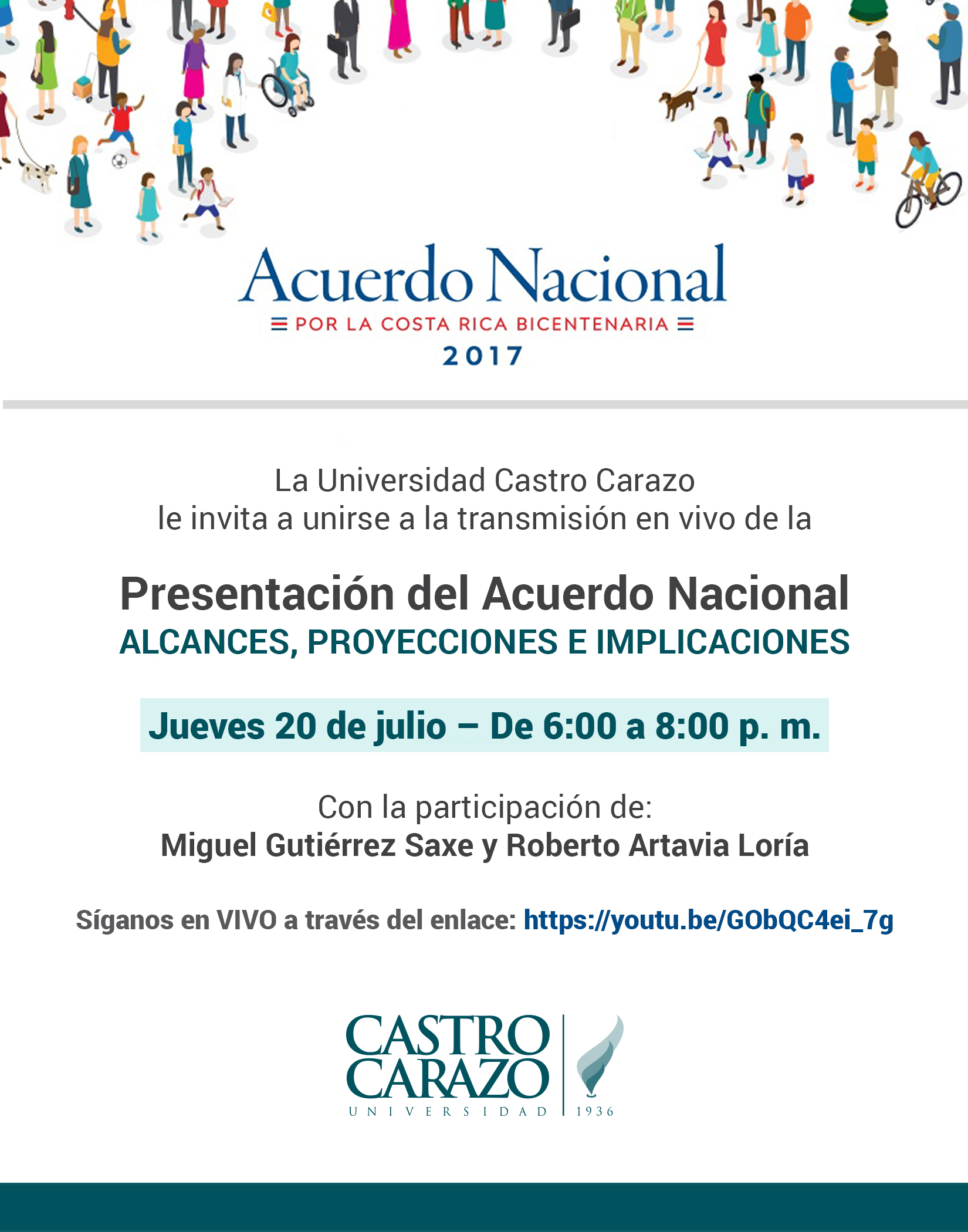 Los coordinadores de la agenda del “Acuerdo Nacional”, señores Miguel Gutiérrez Saxe y Roberto Artavia Loría, realizarán una presentación el próximo jueves 20 de julio de 6:00 a 8:00 p. m.