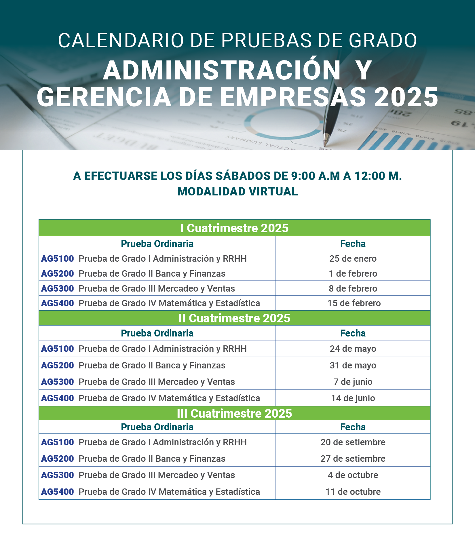 La Dirección Académica de Administración comunica aspectos de interés para los estudiantes de Licenciatura que presentarán Pruebas de Grado durante el año 2025.
